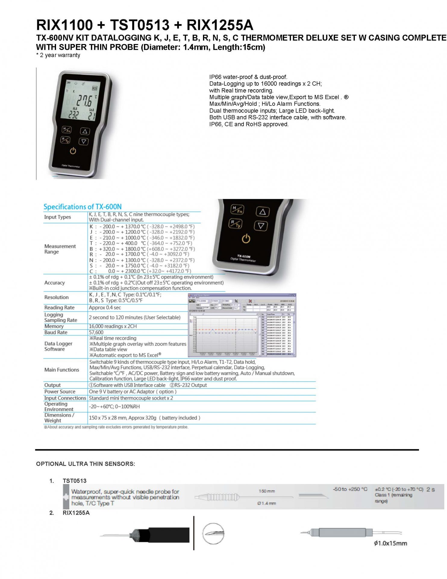RIX1100+TST0513+RIX1255A KIT K, J, E, T, B, R, N, S, C THERMOMETER DELUXE SET W CASING COMPLETE WITH SUPER THIN PROBE