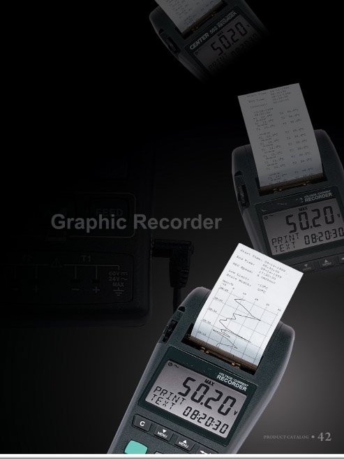 a temperature graphic recorder with built in printer. The printer can output text format so that the users can get the exact reading, or it can output graphic format to give the whole changing tendency in one image. The sample period and the graphic scale are programmable so the users can get the exact result as expected. Besides the printer function, this unit is also a datalogger. The recorded data can be logged to a computer for further analysis.