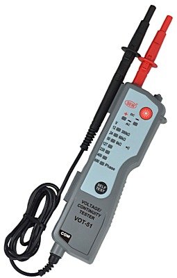 ● Voltage test: 12V to 690V AC/DC (7 LEDs) with indication by buzzer. ● Voltage range: 12V, 24V, 50V, 127V, 230V, 400V, 690V. ● Polarity test: LED +/- ● Audible continuity test ● Self-test button to ensure proper function of the device prior to testing. ● Waterproof design, protection class: IP54 ● Phase / Neutral identification ● Integrated storage clips for test probe. ● Rubberized injection molding.